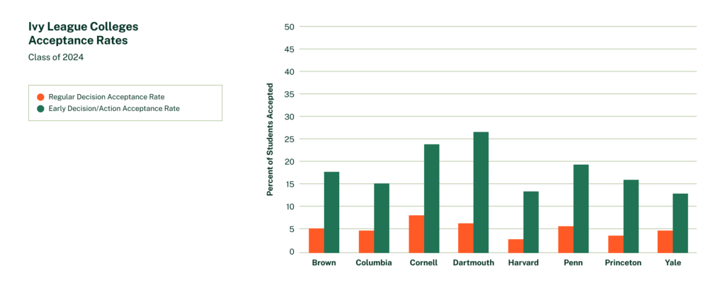 The graph below of the 2024 Ivy League admissions statistics shows a comparison between the Early Decision / Early Action acceptance rates and the Regular Decision acceptance rates: