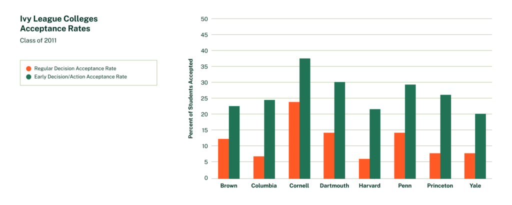 The graph below of the 2011 Ivy League admissions statistics shows a comparison between the Early Decision / Early Action acceptance rates and the Regular Decision acceptance rates: